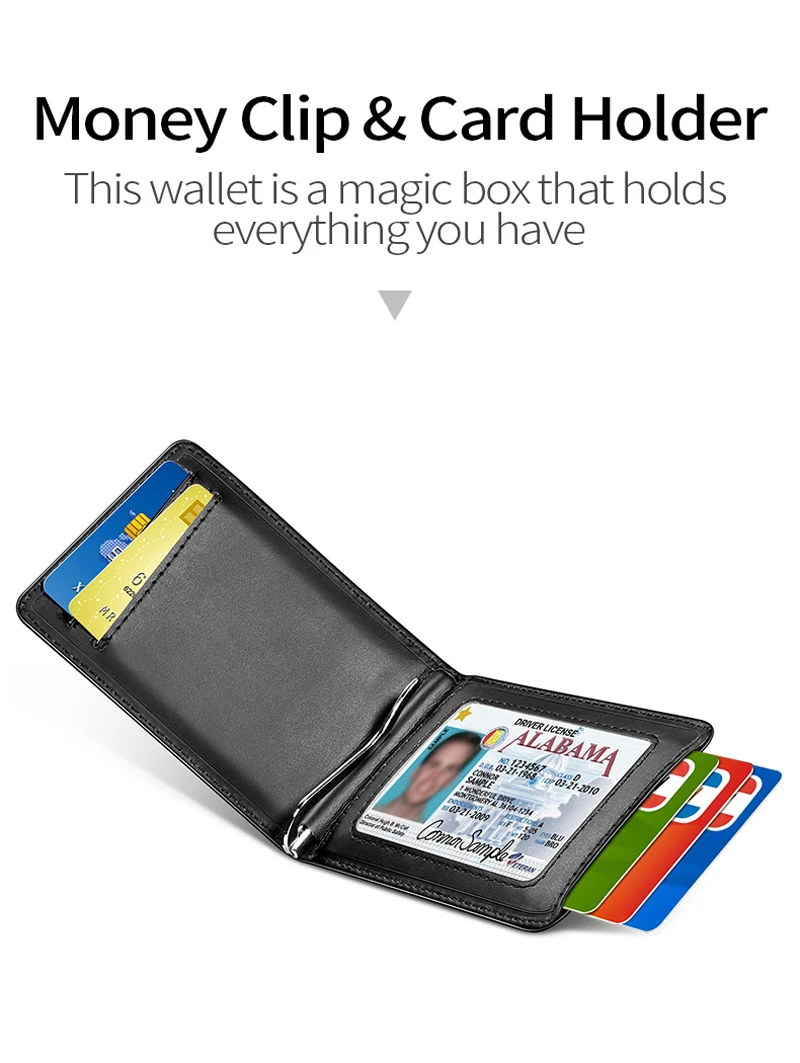 Best Product NewBring Card Case Black Cow Leather Wallet Money Clip RFID Block Driver License Cash OrganizerMen